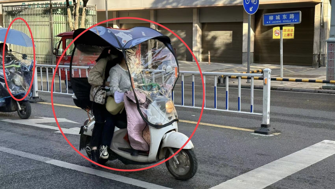 【违法行为】:未佩戴安全头盔、违法加装遮阳(雨)篷