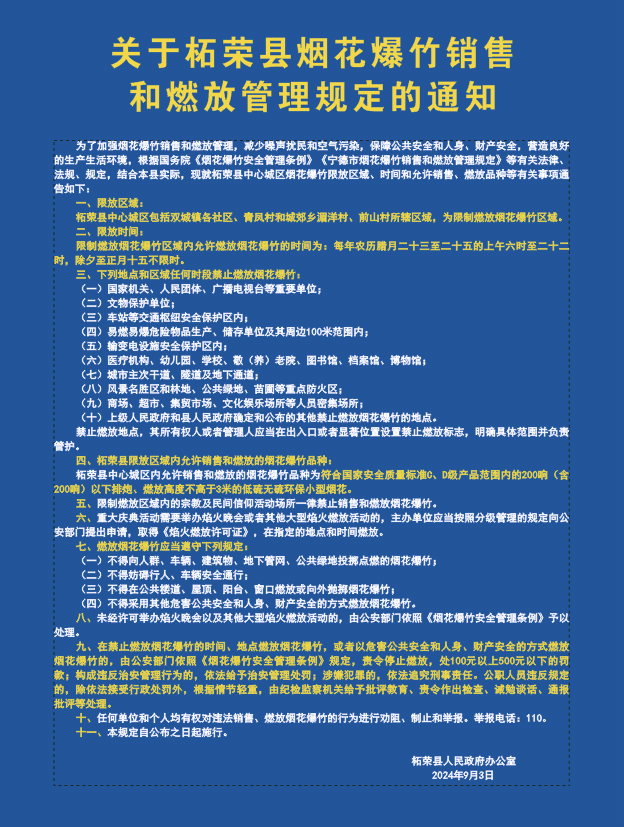 公安机关将继续加大管控力度,坚决守住安全底线。恳请广大市民理解、支持和配合禁燃禁放工作,携手共建天更蓝、空气更清新、环境更安全的美丽柘荣。