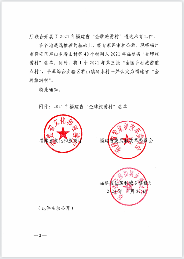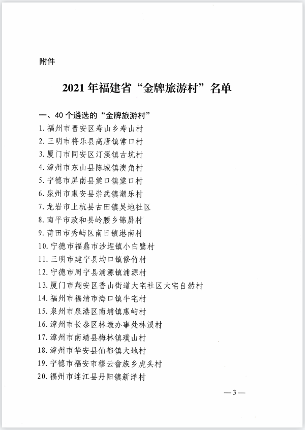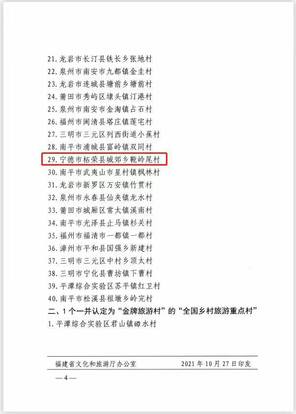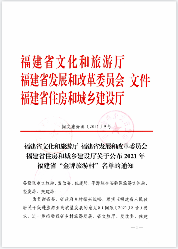 近日,福建省文化和旅游厅、福建省发展和改革委员会、福建省住房和城乡建设厅联合发布2021年福建省“金牌旅游村”名单,我县城郊乡靴岭尾村成功入选。