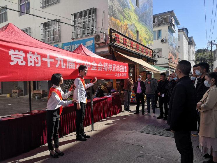 11月12日,在东源乡福源社区文化广场上,乡小板凳宣讲员轻快活泼的宣讲,使全会精神迅速传递给基层群众,现场气氛活跃热烈,时不时可以听见群众的夸赞声和鼓掌声。