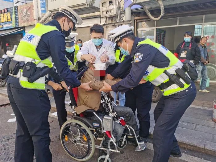 11月11日下午,交警大队执勤人员巡逻辖区上桥路段时,发现路边有一群众躺倒在路边,头部鲜血直流,身体情况不明,执勤民、辅警迅速做出反应,第一时间进行止血救治,随后执勤人员一边维护现场交通秩序,一边附身守在受伤群众身边,避免其受到二次伤害,拨打了120急救电话,并联系了其家属。随后,执勤民、辅警协助医护人员将受伤群众扶上轮椅,送往医院救治。