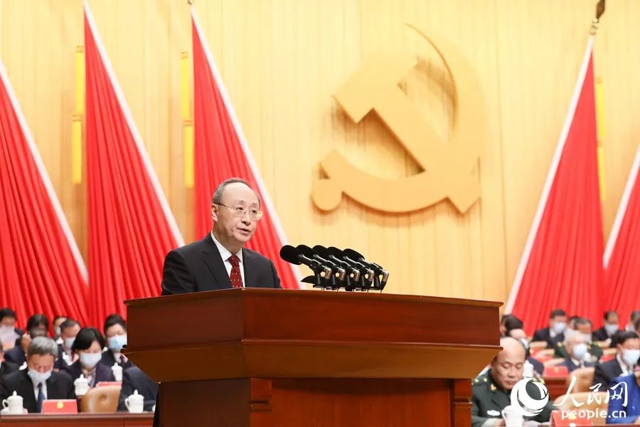 尹力代表中国共产党福建省第十届委员会向大会作报告。人民网 兰志飞摄