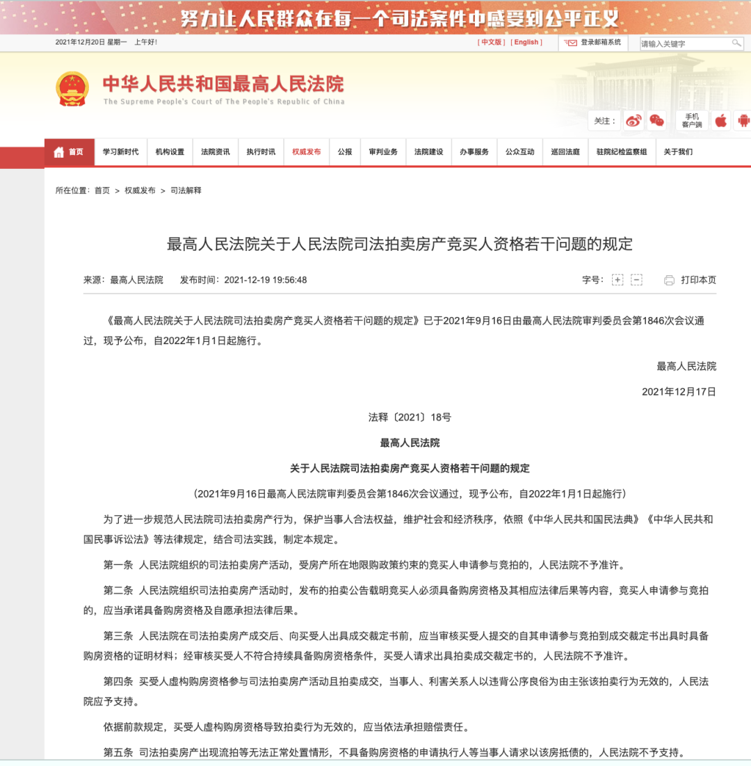 12月19日,最高人民法院在其官网发布了《关于人民法院司法拍卖房产竞买人资格若干问题的规定》,这一《规定》于今年9月份由最高人民法院审判委员会第1846次会议通过,2022年1月1日起施行。