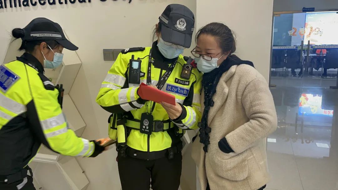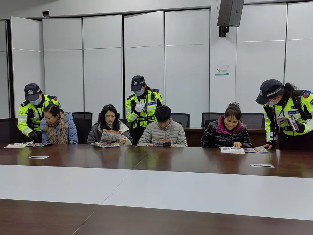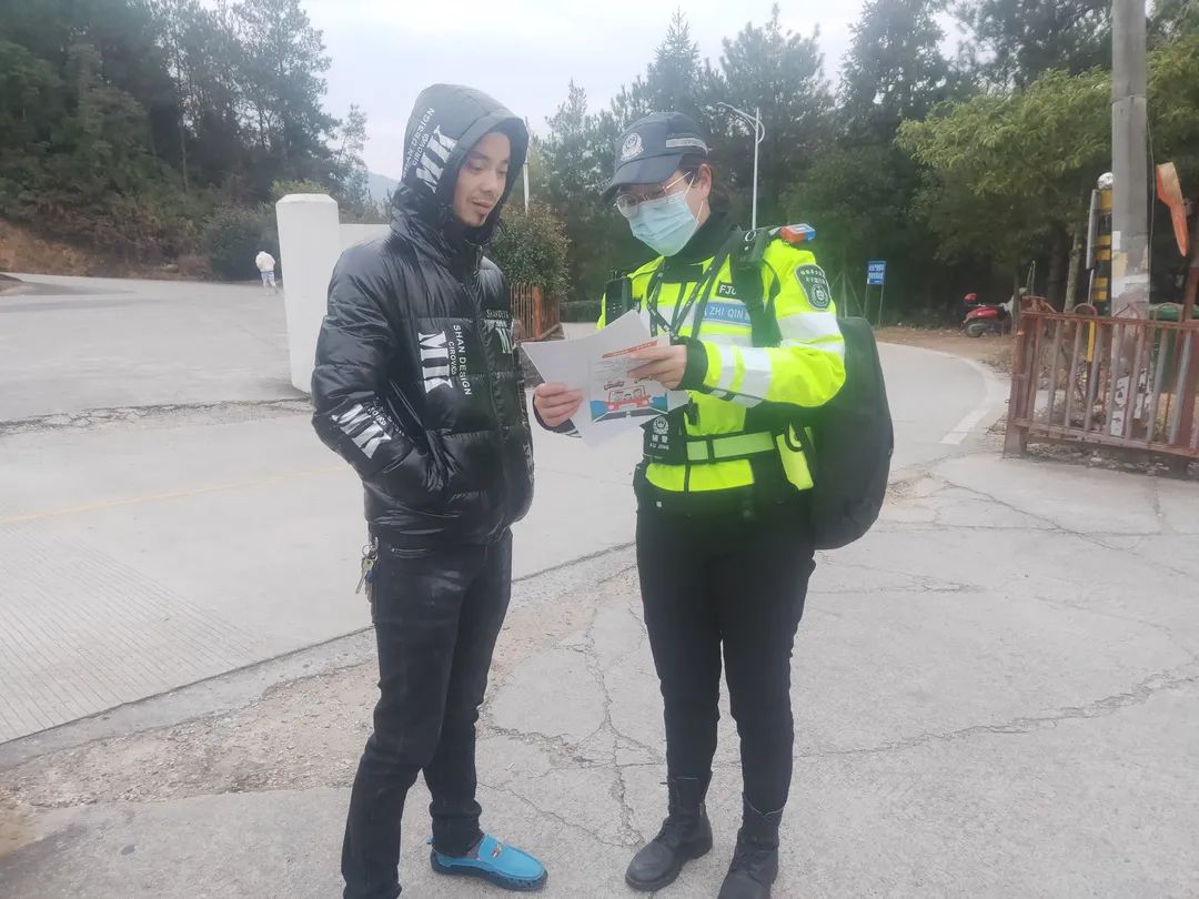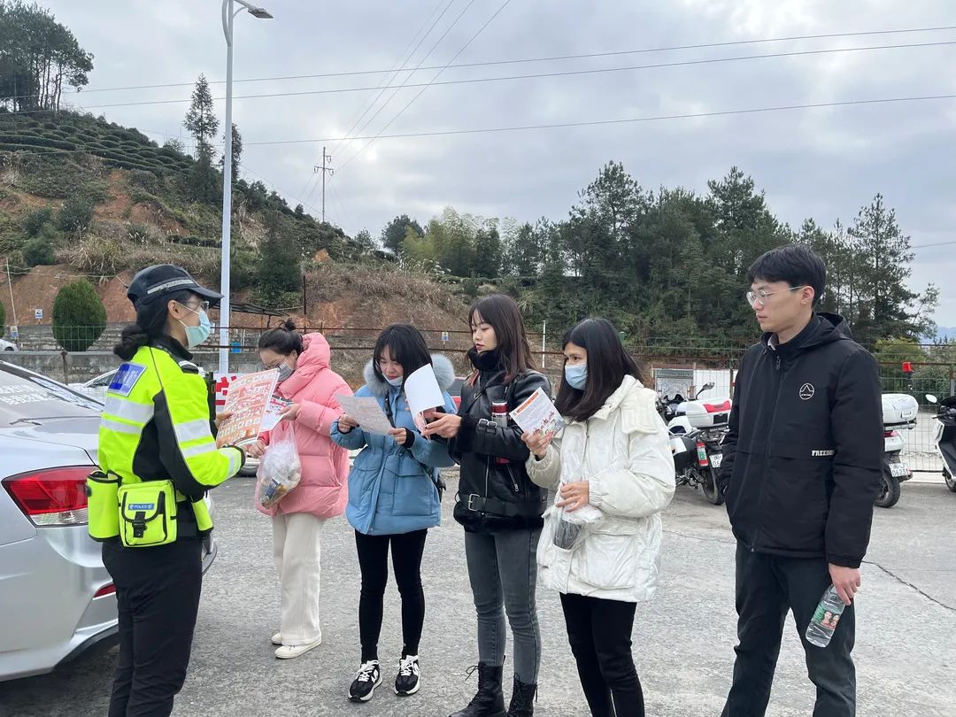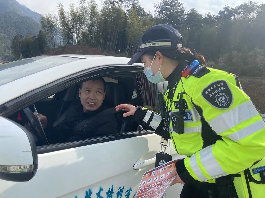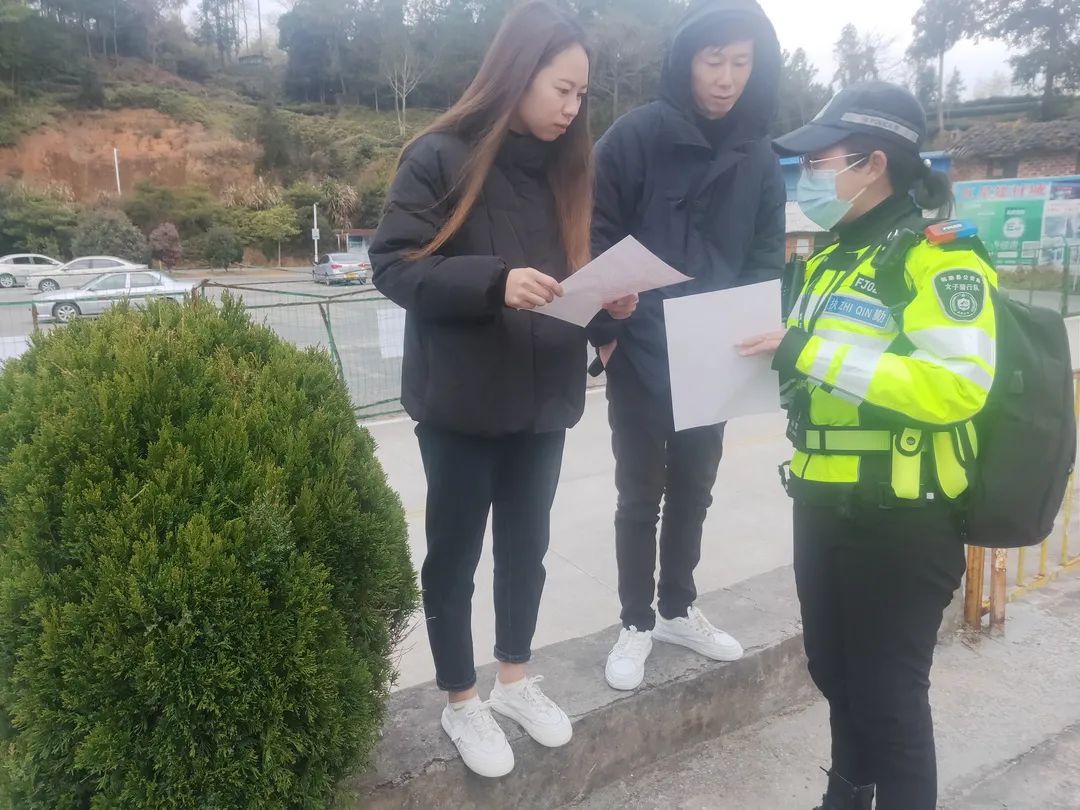 女骑向驾乘人员分发安全知识宣传单页,引导他们在驾乘车辆时正确使用安全带。