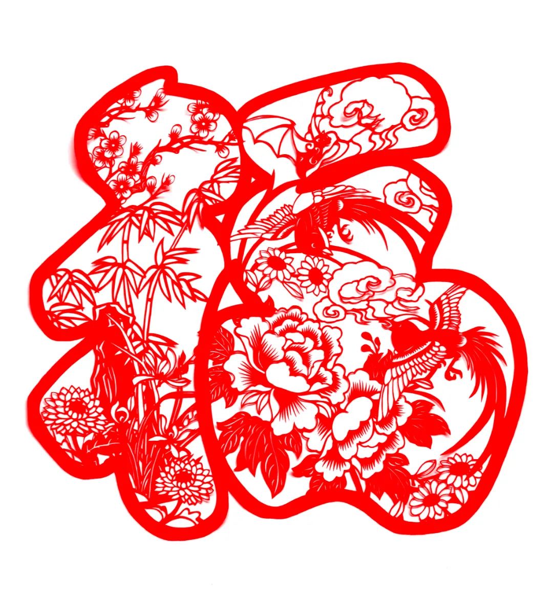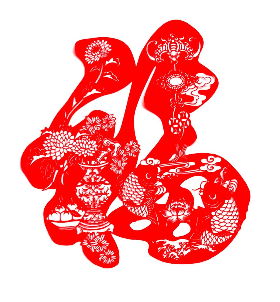 作品以福字为外部轮廓,在福中加上寿桃和鹿寓“寿禄”,胖娃娃骑鱼加莲花铜钱寓子孙万代财源滚滚年连有余,瓶插牡丹蝙蝠倒挂加铜钱,寓平安富贵福在眼前,喜鹊梅花是喜上眉梢、牡丹蝴蝶寓富贵满堂,鸳鸯荷花寓和和美美。