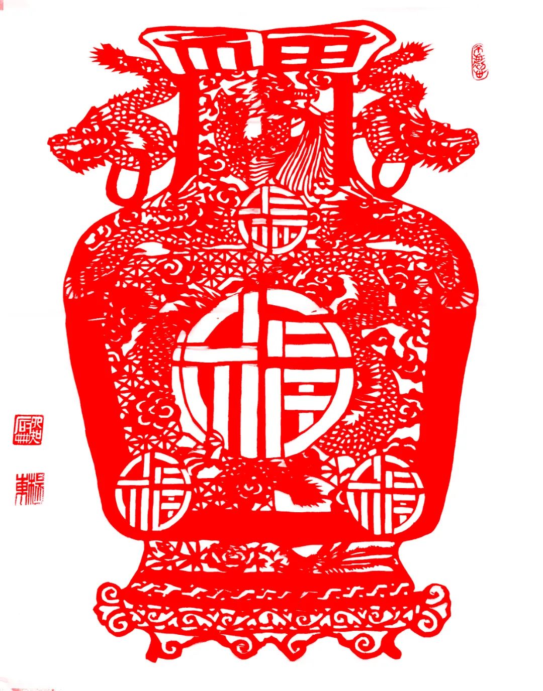 作品以传统龙纹、福字及瓶为主图案,辅以竹、牡丹凤凰、祥云等纹饰。组成:平(瓶)安中国(龙)平安福(福字及吉祥纹饰),寓意中国平安富强,中国人纵横有福,岁岁平安。