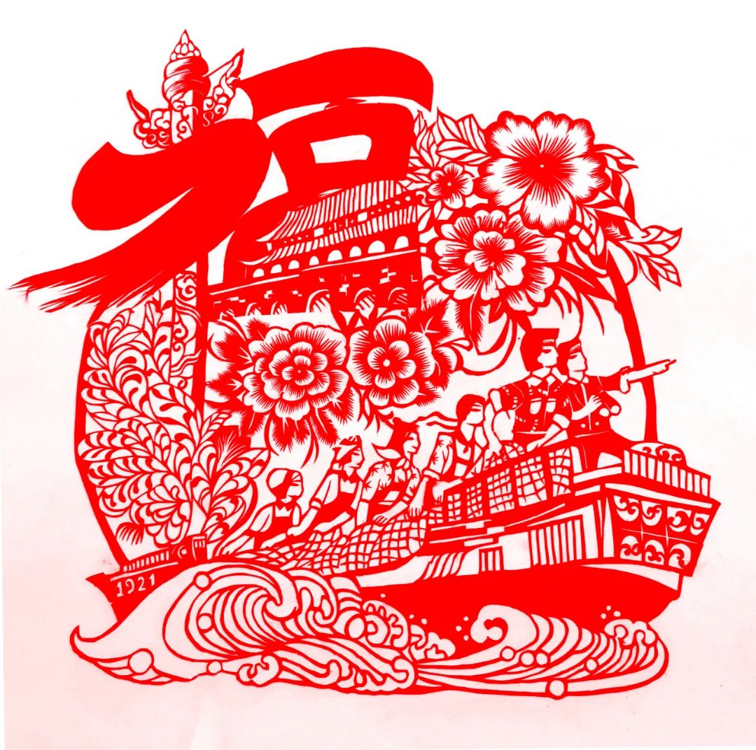 以“党的丰功伟业”为主线,百年筑梦势如虹,南湖水面一红船;党的百年历程造就如今的幸福生活。结合锯齿纹等剪纸技艺表现手法展示花团锦簇,新时代繁荣福盛。党的故事依旧在畅响,在新征程的我们要铭记革命先辈创立了千秋伟业,祝福祖国、祝福。