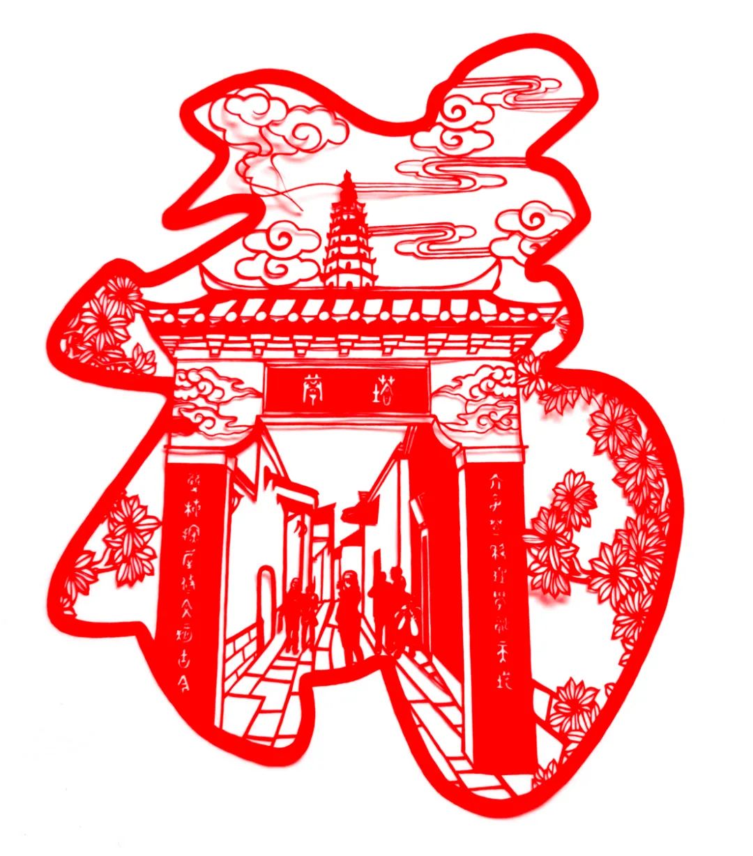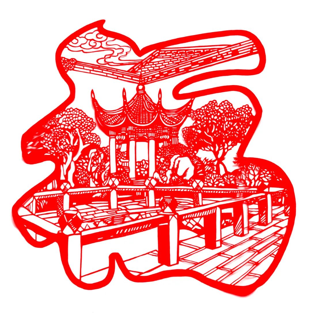 三坊七巷是福州的文化核心区,将民间剪纸与福州历史文物结合在一起,塔巷、郎官巷、及叶氏花厅这三幅“福”字作品,都是在福当中融入了建筑轮廓,有福之州,福柞绵长。