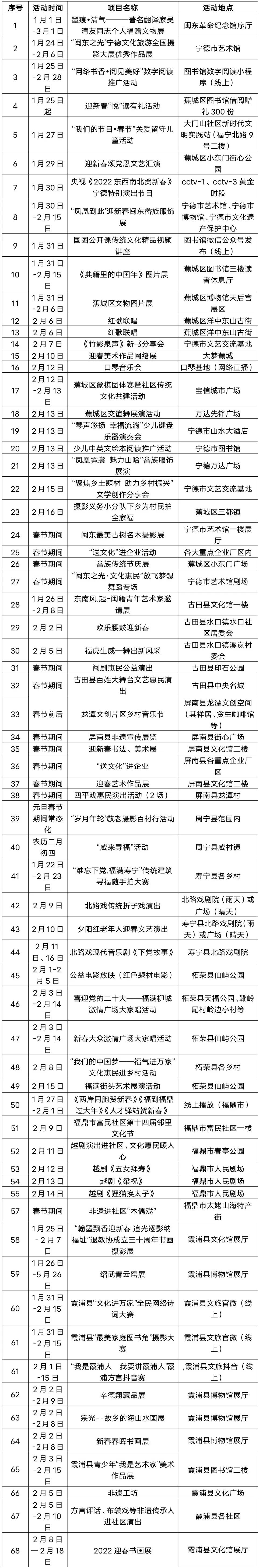 依托文化科技卫生“三下乡”活动以及文化节、旅游节等各种活动,把“福”文化元素植入系列活动中,推动“福”文化进基层,入人心。其中,春节元宵期间,我市共将推出68项“福见宁德·福气活动"。