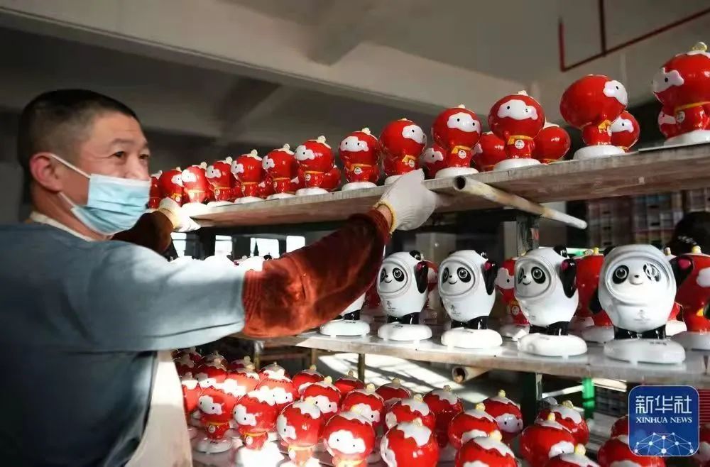 在泉州德化县陶瓷旅游观光工厂,工人摆放制作好的“冰墩墩”“雪容融”。图源:新华社