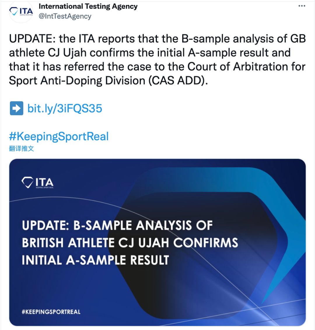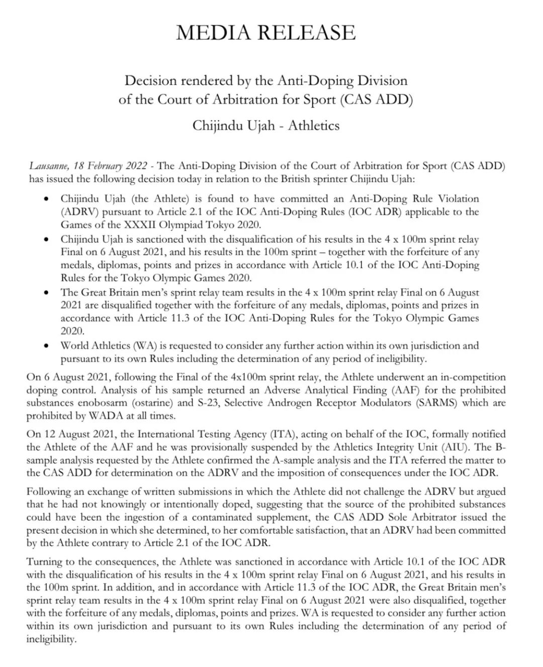当地时间2月18日,国际体育仲裁法庭(CAS)在官网发布公告,确认英国田径运动员乌贾违反反兴奋剂规定,英国男子接力队在东京奥运会男子4×100米接力决赛中的成绩将被取消。