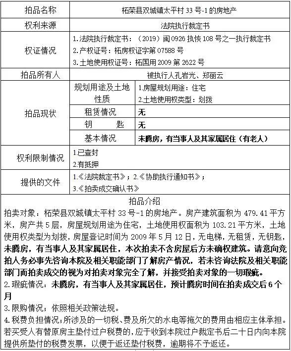 标的位置:柘荣县双城镇太平村33号-1的房地产(该幢建筑物共5层,无电梯,无租赁,无钥匙)