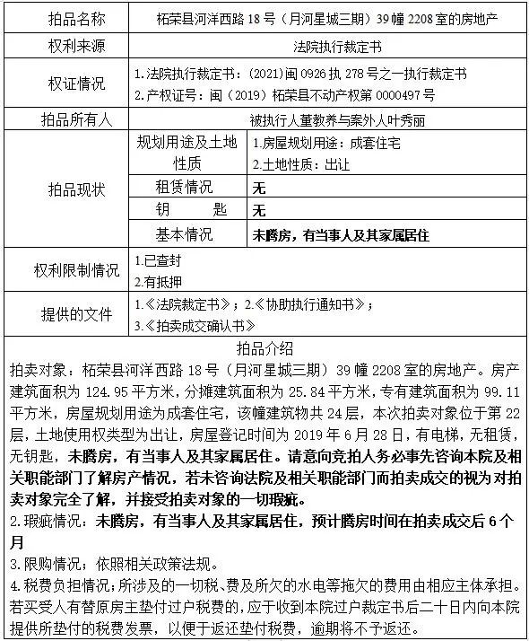 标的位置:柘荣县河洋西路18号(月河星城三期)39幢2208室的房地产(该幢建筑物共24层,本次拍卖对象位于第22层,有电梯,无租赁,无钥匙)