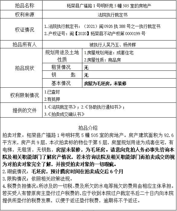 标的位置:柘荣县广福路1号明轩苑5幢505室的房地产(该幢房地产共9层,本次拍卖标的物位于第5层,有电梯,无租赁,无钥匙)