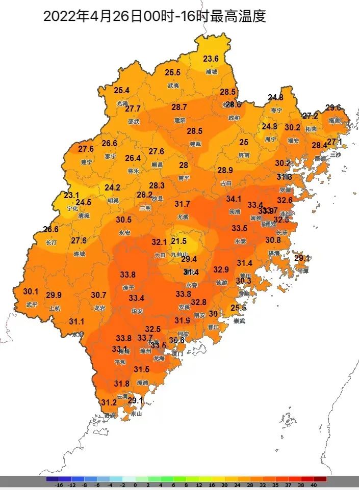 其中闽清县本站34.1℃为最高