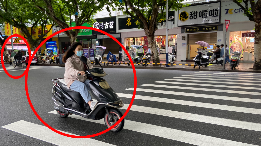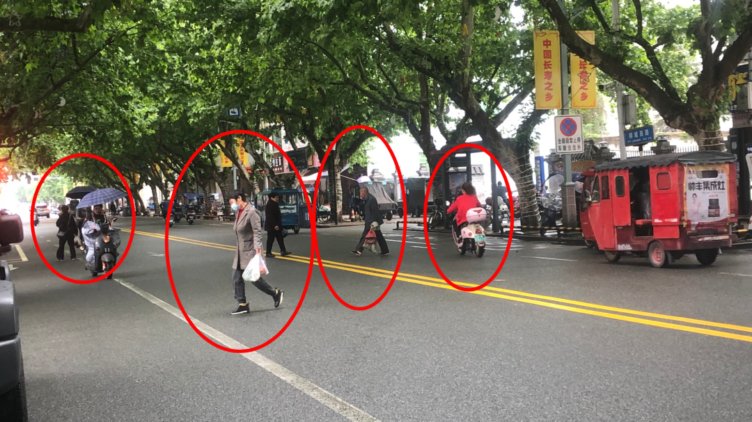 【违法行为】:行人不走斑马线、未佩戴安全头盔