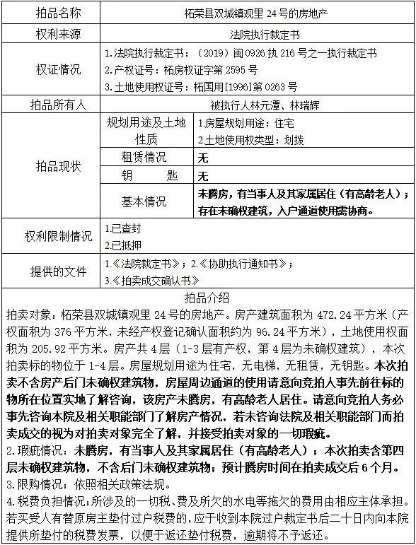 标的位置:柘荣县双城镇观里24号的房地产(房产共4层,1-3层有产权,第4层为未确权建筑,本次拍卖标的物位于1-4层,无电梯,无租赁,无钥匙)