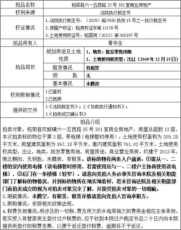标的位置:柘荣县双城镇六一五西路25号301室商业房地产(该幢建筑物总层数13层,本次拍卖标的物位于第3层,带电梯(电梯暂时停用))