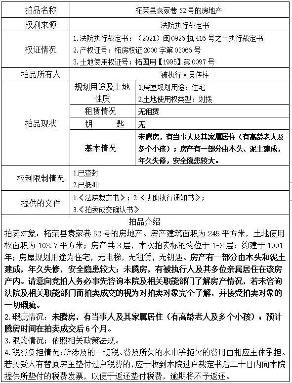 标的位置:柘荣县袁家巷52号的房地产(该幢房产共3层,本次拍卖标的物位于1-3层,无电梯,无租赁,无钥匙)