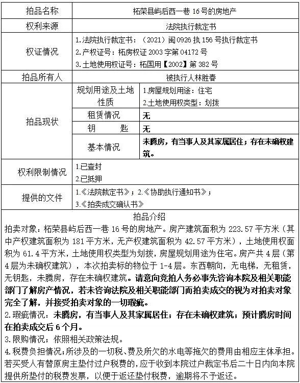 备注:本次拍卖不含房产后门未确权建筑物,房屋周边通道的使用请意向竞拍人事先前往标的物所在位置实地了解咨询。该房产未腾房,有高龄老人居住。预计腾房时间在拍卖成交后6个月。
