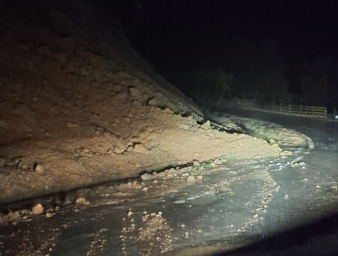 该路段发生泥石流,路面积水严重,正在清理排险中,请车辆和行人绕行。