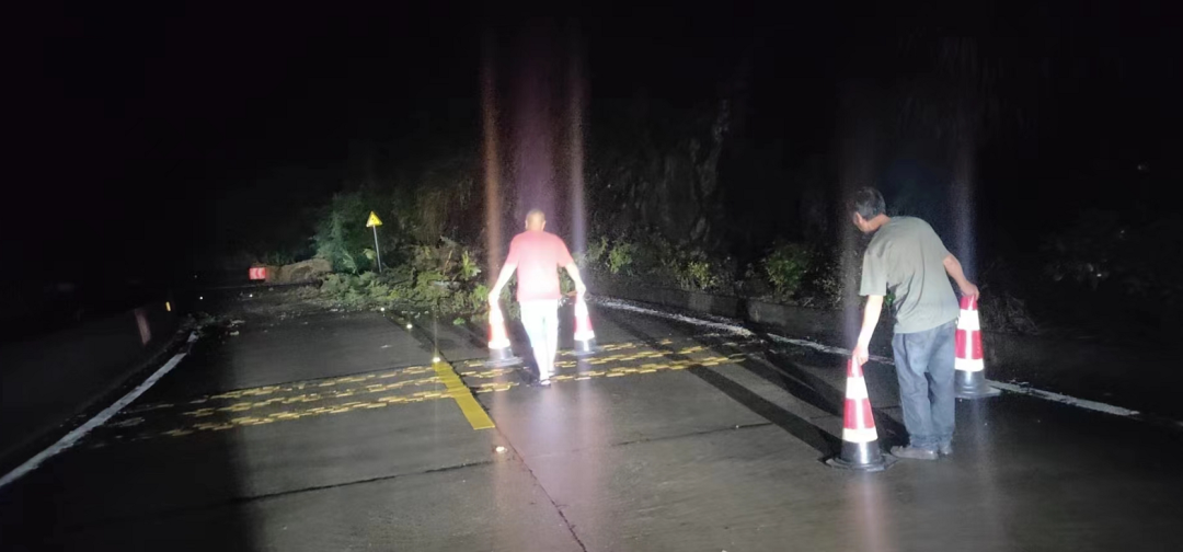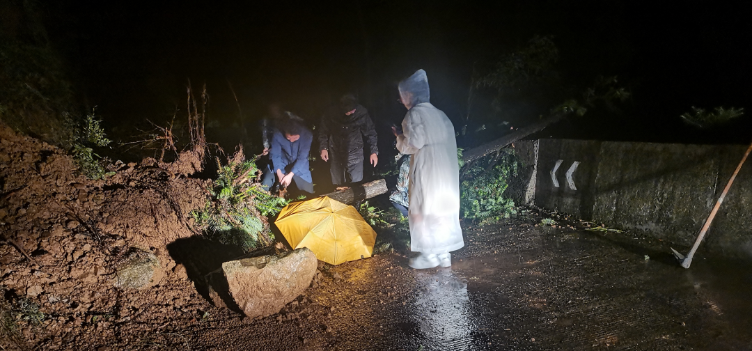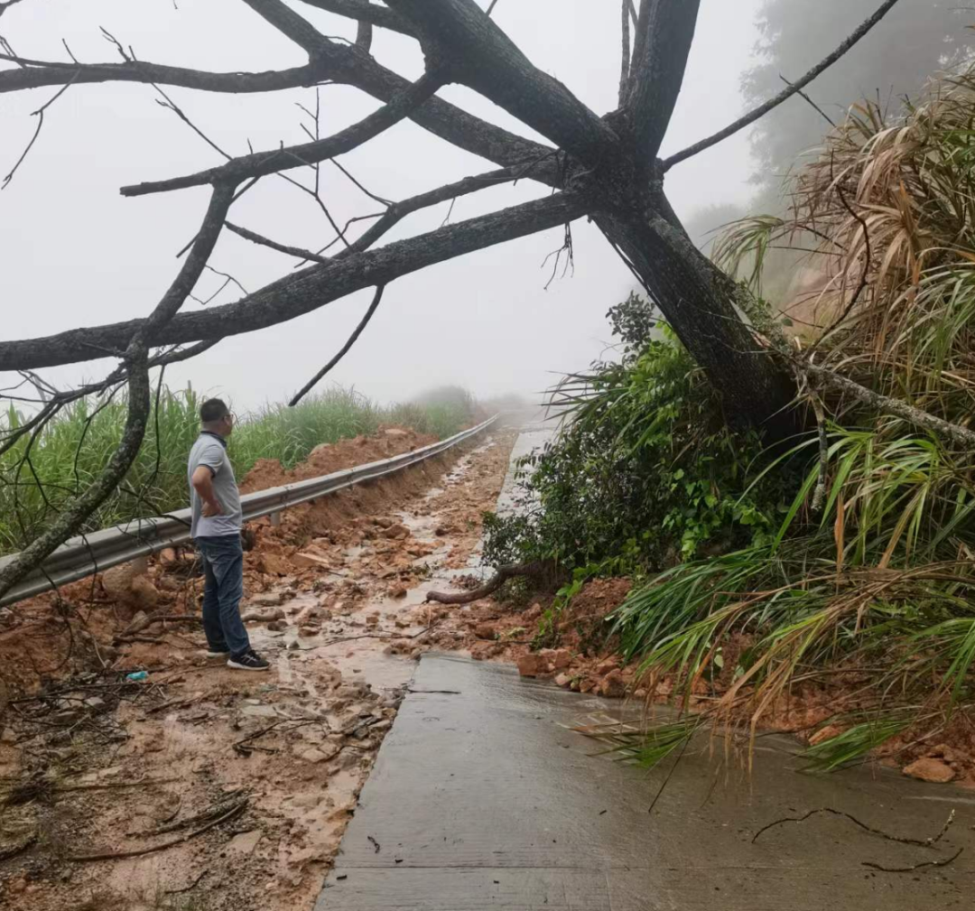 该路段发生道路山体滑坡,树体倒塌,工作人员第一时间清理倒伏树木、疏通道路,确保行人安全和交通畅通。