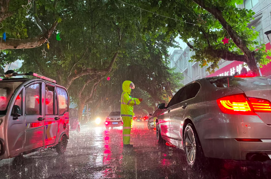 ▲赤岭红绿灯T字路口道路大量积水,交警及时设立警示牌并在现场指挥交通。