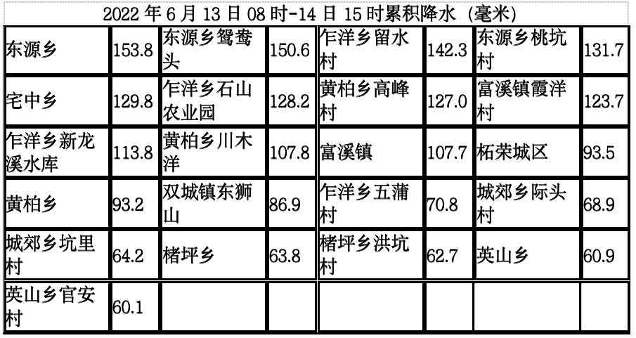 6月13日8时至6月14日15时柘荣县累积降水量,共有5个乡镇的11个区域站点超过100毫米,其中最大为东源乡153.8毫米,城区为93.5毫米。