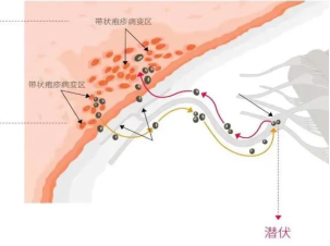水痘痊愈后,VZV并不会完全被清除,随着年龄增长,免疫功能逐渐下降,病毒可能会再激活通过轴突顺行重新来到皮肤细胞中引发带状疱疹。