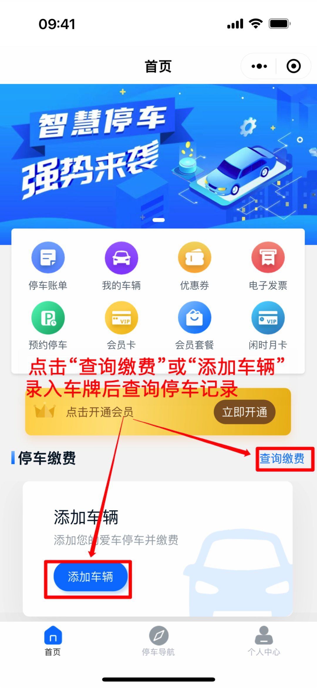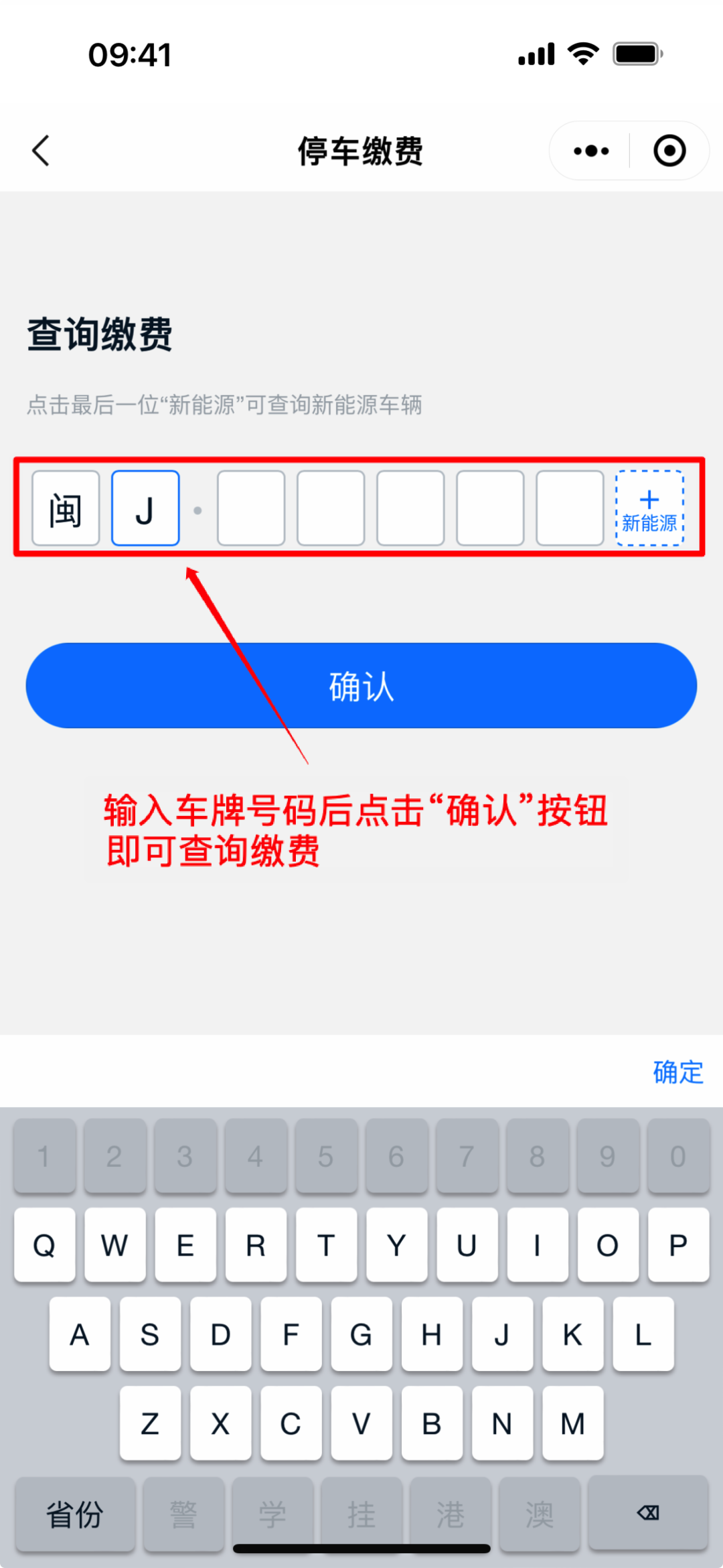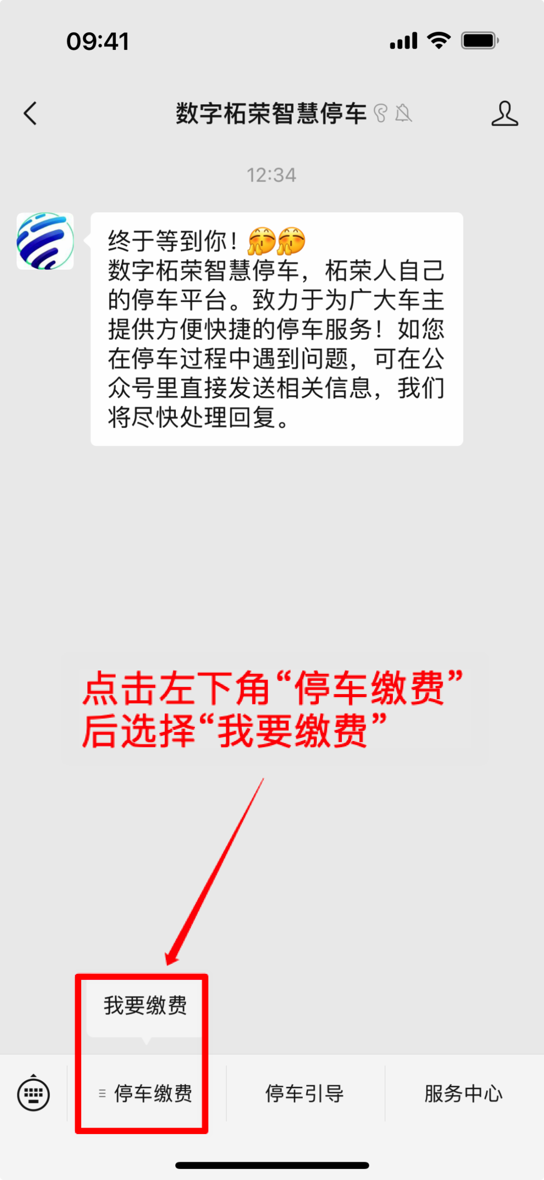 点击“关注”→点击左下角“停车缴费”按提示输入信息即可登录用户界面→点击“查询缴费”→输入车牌号码,按“确认”键即可进行缴费。