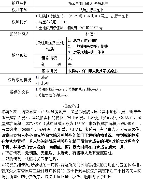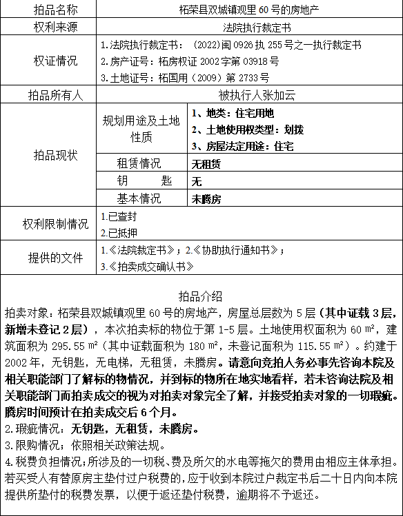 标的位置:柘荣县双城镇观里60号的房地产,房屋总层数为5层(其中证载3层,新增未登记2层),本次拍卖标的物位于第1-5层。