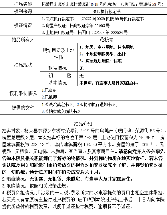 标的位置:柘荣县东源乡东源村荣源街8-19号的房地产(现门牌:荣源街58号),房屋总层数3层,本次拍卖标的物位于第1-3层。