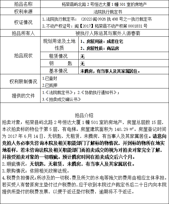 标的位置:柘荣县屿北路2号恒达大厦1幢501室的房地产,房屋总层数15层,本次拍卖标的物位于第5层,有电梯。