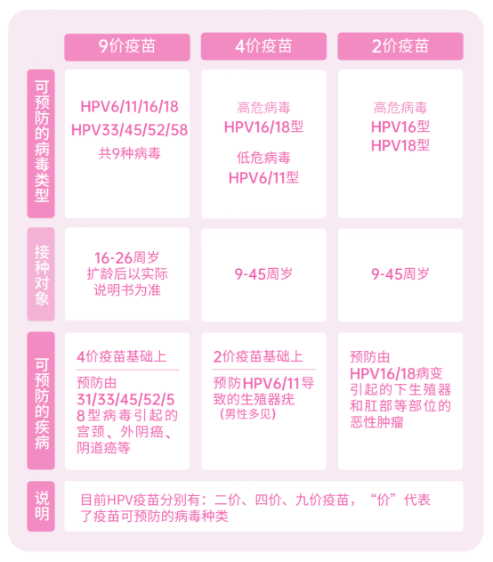 按照预防HPV型别来区分,目前有2价、4价和9价三种宫颈癌疫苗获得批准上市: