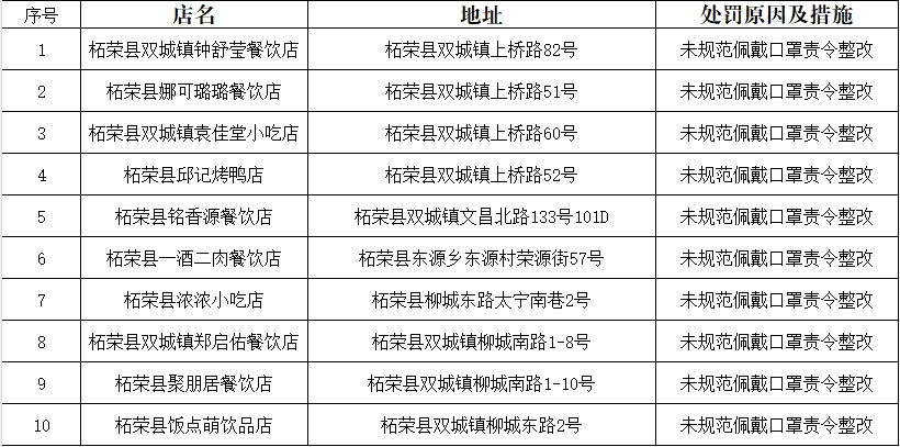 为持续抓好辖区餐饮单位落实《福建省餐饮服务从业人员佩戴口罩的规定》,促进餐饮服务规范文明,保障食品安全卫生和公众身体健康,柘荣县市场监管局开展从业人员佩戴口罩检查行动。本次检查共出动执法人员15人次,检查餐饮单位76家次,发出责令整改通知书10份。对未规范佩戴口罩的10家餐饮单位进行处罚,名单如下: