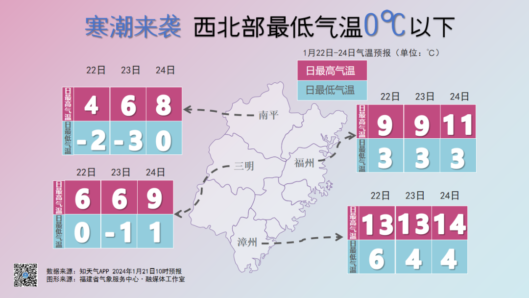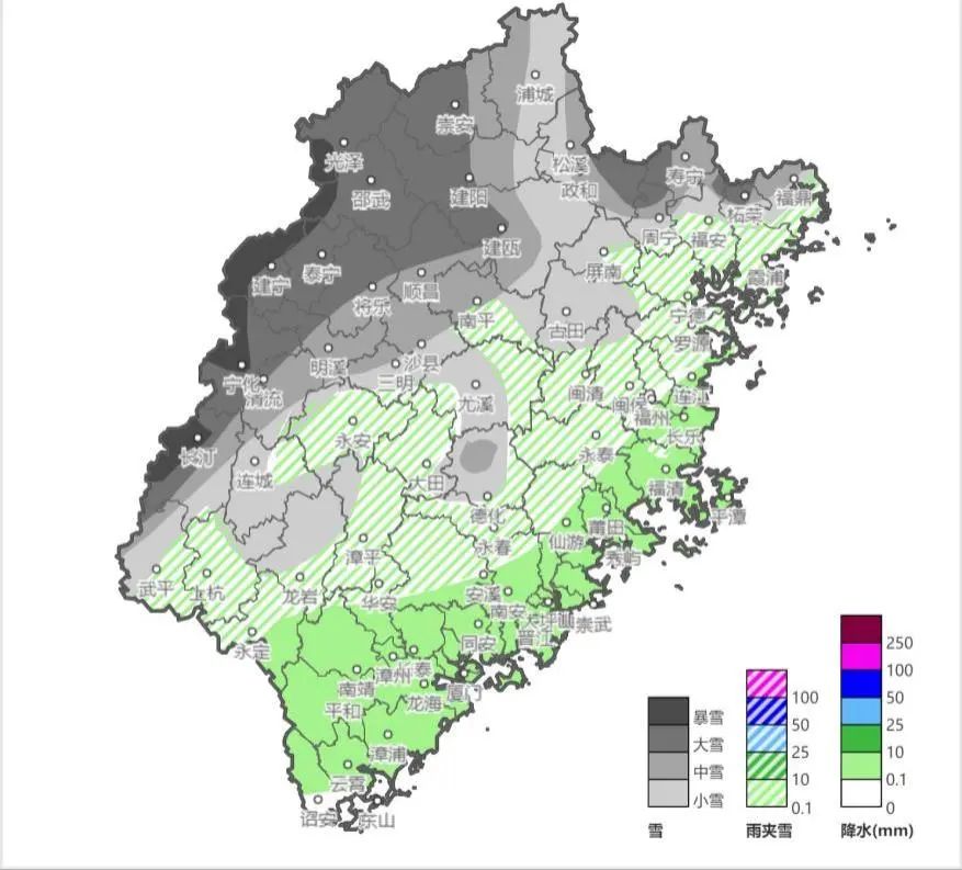 今天夜间,中北部地区有小雨。南平(浦城、光泽、武夷山、邵武)、三明(建宁、泰宁)和宁德(寿宁、周宁、柘荣)有雨夹雪或小雪。22日,中北部地区有小雪或雨夹雪,南平大部、三明(建宁、泰宁、宁化、清流、明溪、将乐、沙县)、宁德(寿宁、周宁、柘荣、福鼎、屏南)、龙岩(长汀、连城、武平)和泉州(德化)有中到大雪,局部暴雪,其余地区大部有小雨。23日,全省阴到多云,白天西部地区局部有雨夹雪或小雪。