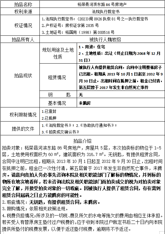 柘荣县河滨东路86号房地产,房屋共5层,本次拍卖标的物位于1-5层