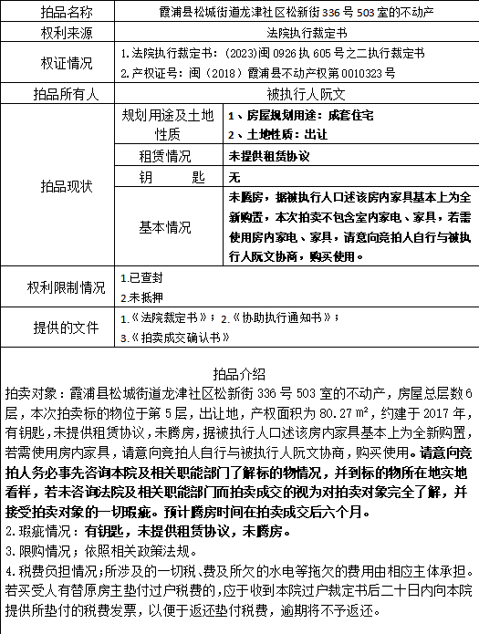 霞浦县松城街道龙津社区松新街336号503室的不动产,房屋总层数6层,本次拍卖标的物位于第5层