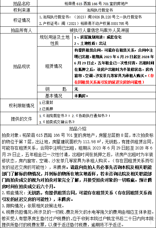 柘荣县615西路166号701室的房地产,房屋总层数8层,本次拍卖标的物位于第7层